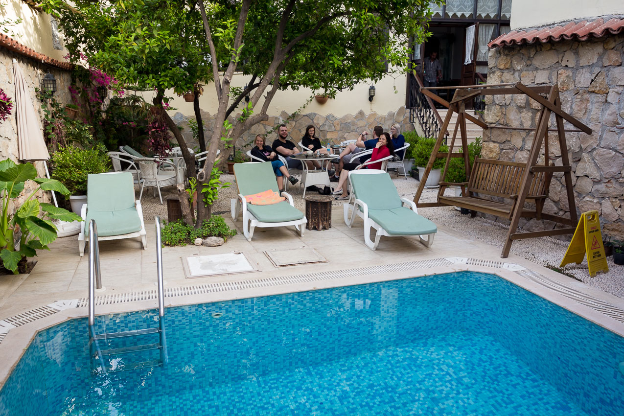 Zavazadla se objevují na pásu a my se dostáváme před letiště. Domlouváme 2 taxíky, které nás zavezou do předem objednaného hotelu Kaleici. Je to celkem pěkný a levný hotel v historickém jádru Antalye. Posledních 200 metrů jedeme v úzkých uličkách mezi procházejícími se lidmi, mezi lidmi sedícími před restaurací a já si připadám jako kretén 🙂