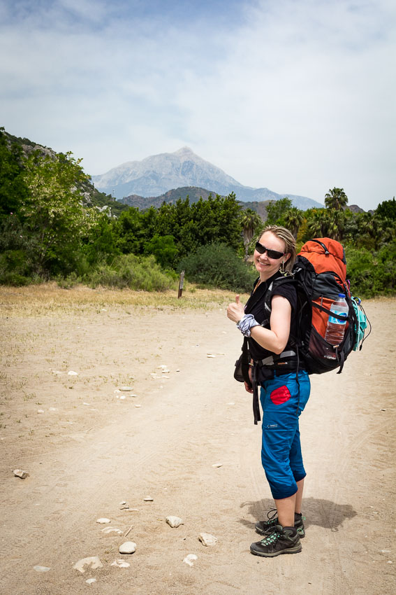 Průser je, že mě stále bolí ta achilovka a nelepší se to. Po procházce v Olymposu se ještě zastavujeme na pláži a dáváme si jídlo z vlastních zásob. Třeba tím trošku ulevíme váze. V dálce jde vidět Tahtalı Dağı a připadá mi to hrozně daleko. Katka má chuť se okoupat v moři, ale já si nemyslím, že je to dobrý nápad. Není tu sprcha a jít slaný z moře túru může být nepříjemné.