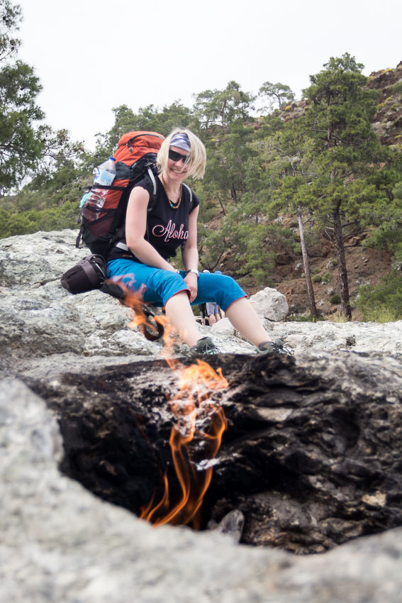 Vítám přestávku u vstupu do oblasti ohňů. Platíme vstupné a dáváme pivko. Poté stoupáme nahoru a achilovka trošku přestává bolet. Buď pomohlo to pivo anebo to stoupání. Ohně Chiméry jsou ve skutečnosti přírodní vývěry zemního plynu a pojmenování dostaly po mytologické příšeře Chiméře. Tyto ohně tam hoří už několik tisíc let.