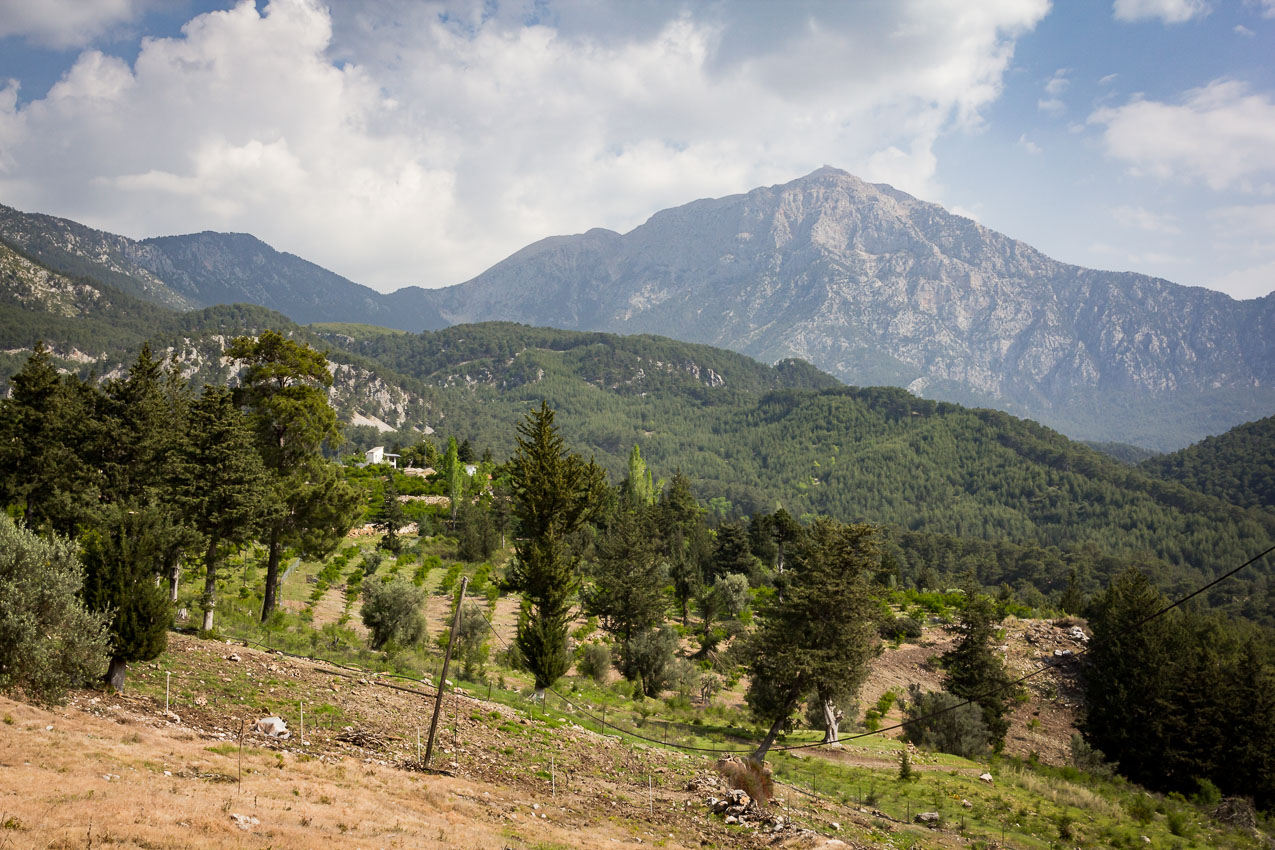 V městečku (spíše je to vesnice) si ještě dáváme čerstvě vymačkanou šťávu z pomerančů. Stojí to pár korun a chutná výtečně. Místní chlapi se nás ptají, kam jdeme. Tahtalı Dağı, odpovídáme. „Jóóó, to je tak ještě 6 hodin cesty“, dozvídáme se. Dle mapy je to cca 30 km, 2971 metrů stoupání, 654 metru klesání. A takových supermanů je v Turecku hodně (viz později).